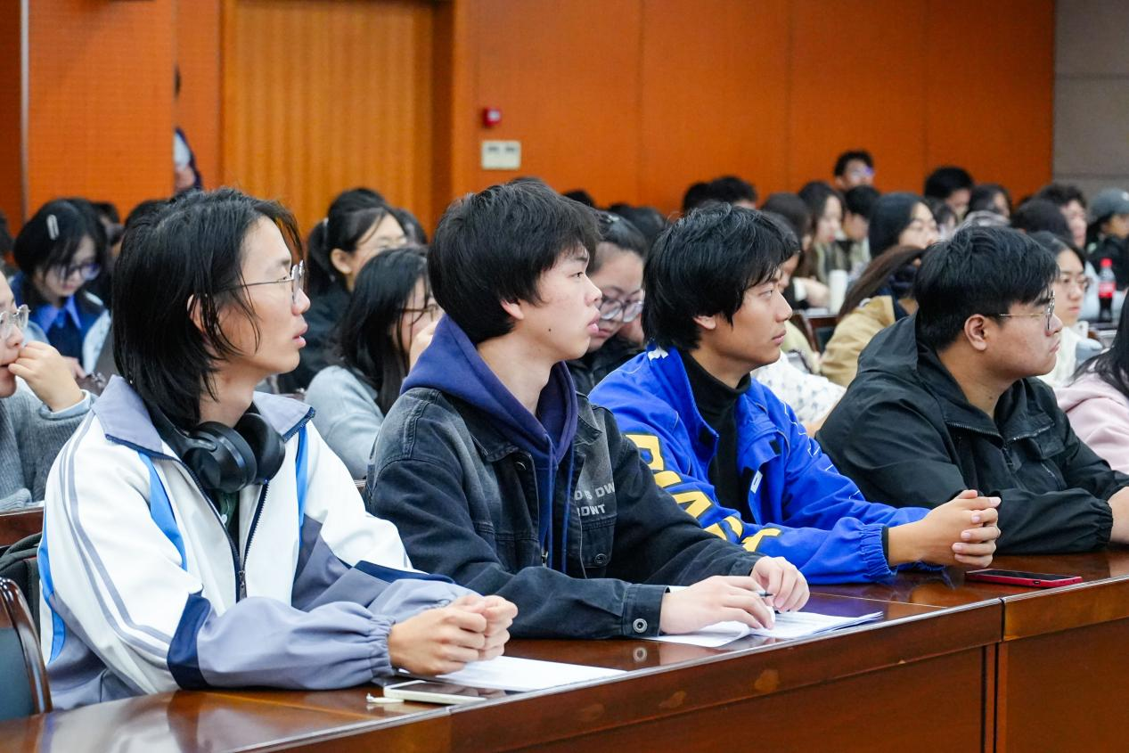 讲座中,何浩着手从胜任力、持续力和自洽力三个方面介绍了教育从业者的职业要求和精神追求。何浩的职业生涯经历了从一名普通的任课老师到校长的岗位变化,具有对教育事业多维的思考。他通过生动的案例,向同学们描绘了一线教师们如何利用专业的理论知识和丰富的实践经验,将时间和情感投入到教育事业中,展现了极强的使命感。他讲述了自己作为一名教师经常从工作中获得价值感和幸福感,然而,他时刻用敏锐的目光观察教育工作者在社会眼中的形象,在极高的精神回报背后是近乎严苛的职业道德要求。“社会将职业高标,视作了职业低标”一句话犀利地点明了教师行业所面对的社会压力。