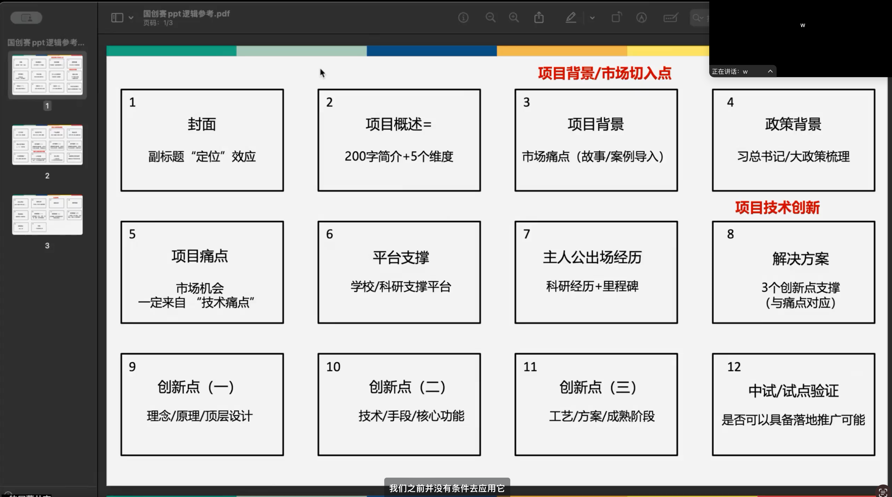 讲座特别针对校赛选拔机制,王承超建议参赛者构建 "3 月中试 - 6 月认证 - 9 月签约" 的动态推进档案,即使部分数据未完善,也需展现清晰规划。他强调项目叙事需突出 "问题 - 方案 - 验证" 三段式逻辑,在无码影片标注 核心竞争力,并通过财务预测雷达图、院士站台视频、农户就业数据等多元材料强化社会价值。