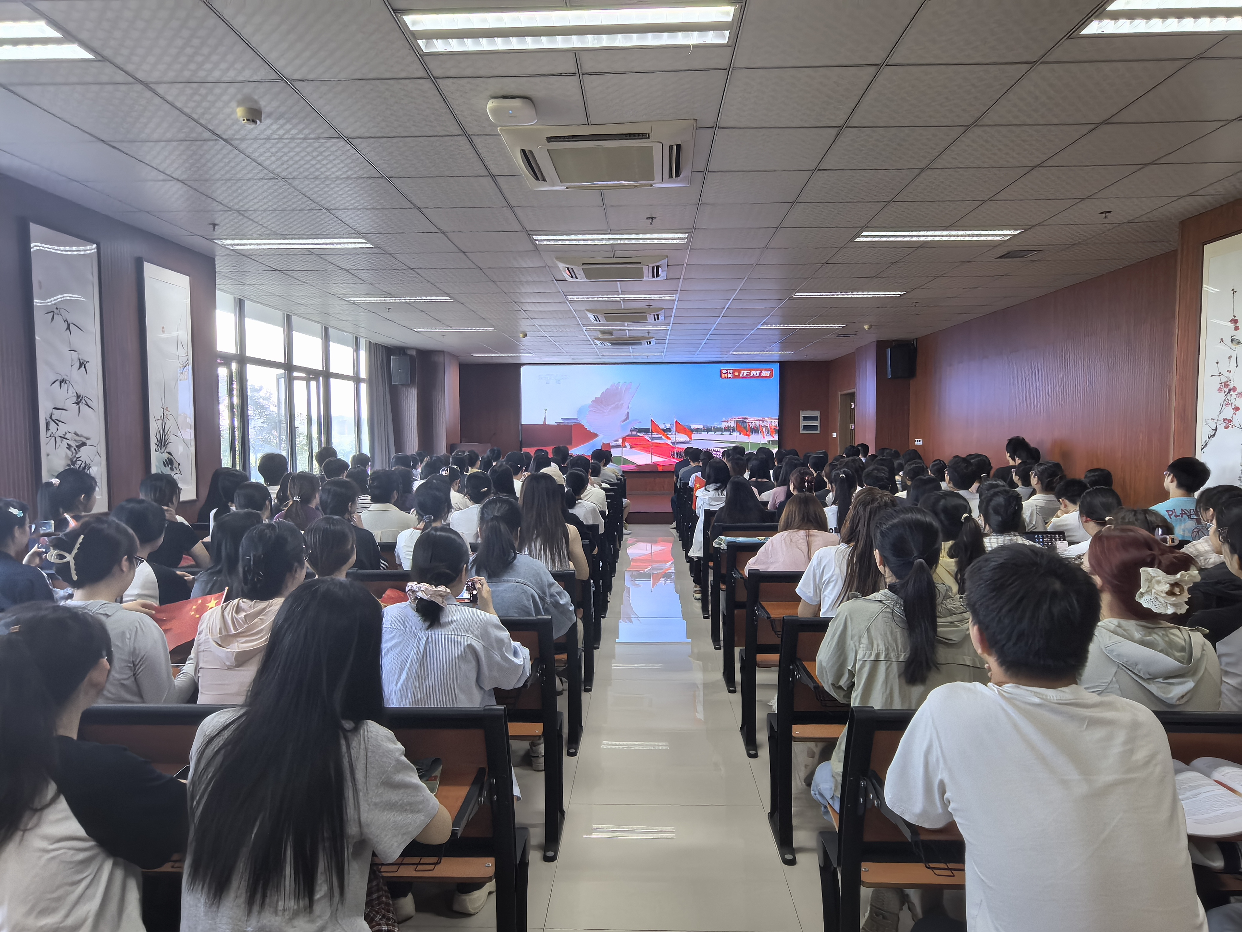 大会开始前,主会场内气氛庄严肃穆。师生们满怀对历史的敬畏和对先烈的追思,早早入场就座。当庄严的国歌奏响,全体师生自发肃立,齐声高唱,激昂的旋律回荡在整个会场,直播过程中,师生们全神贯注,认真聆听了习近平总书记的重要讲话,习近平指出,中国人民抗日战争是世界反法西斯战争的重要组成部分,中国人民以巨大的民族牺牲,为拯救人类文明、保卫世界和平作出了重大贡献。80面抗战英模部队荣誉旗帜组成的战旗方队,承载着历史荣光浩荡而来。新型坦克、无人智能、网电作战、高超声速、防空反导、战略导弹……从抗战时期土枪土炮到今天新型作战力量,国产现役主战装备和战略重器在天安门城楼前一一通过,展示坚决捍卫国家主权安全发展利益、坚定维护世界和平的钢铁意志和强大实力。