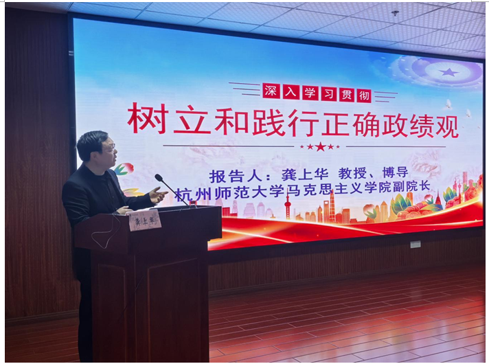 各项工作实现高质量发展,学院邀请马克思主义学院副院长龚上华教授作了题为《树立和践行正确政绩观学习教育》专题讲座,讲座围绕正确政绩观的核心内涵、时代背景与实践要求、高质量发展展开深入学习。龚教授指出,正确政绩观是干事创业的根本指引,当前发展形势下,摒弃形象工程、形式主义等错误观念,树立求真务实、为民造福的政绩理念,坚持高质量发展的导向,这对高校教育科研工作意义重大。